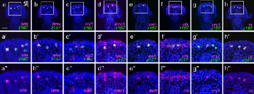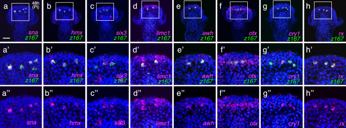 Fig. 3. Co-expression genes in dorsal serotonergic neurons with z167/opn5L.a–h Co-expression patterns of sna, hmx, six3, awh (lhx6), otx, cry1, and rx with z167, which exhibited relatively high expression levels in dorsal serotonergic neurons based on single-cell analysis in 48-hour pluteus larvae treated with DMSO (control). All factors were detected in the z167, i.e., opn5L-expressing cells. a-a” Co-expression pattern of sna with z167 in 48-hour larvae. Bar = 20 µm. b-b” Co-expression pattern of hmx with z167 in 48-hour larvae. c-c”. Co-expression pattern of six3 with z167 in 48-hour larvae. d-d” Co-expression pattern of limc1 with z167 in 48-hour larvae. e-e” Co-expression pattern of awh with z167 in 48-hour larvae. f-f”. Co-expression pattern of otx with z167 in 48-hour larvae. g-g” Co-expression pattern of cry1 with z167 in 48-hour larvae. h-h” Co-expression pattern of rx and z167 in 48-hour larvae. a’-h” Magnified image of boxed area in (a–h), respectively. All experiments were independently confirmed in more than 3 batches. |