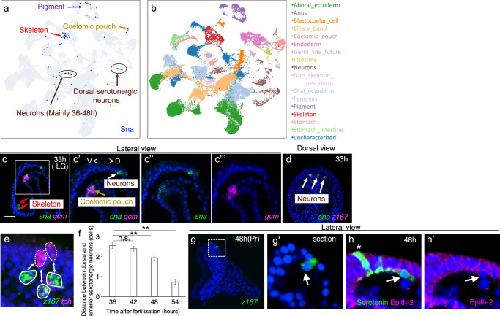 Fig. 4. Potential Snail-mediated migration of dorsal serotonergic neurons toward the anterior region.a, b UMAP representation of snail (sna) expression. sna was expressed in the skeleton, pigment cells, coelomic pouch, and the dorsal serotonergic neurons. c Co-expression pattern of sna and gcm (a marker for secondary mesenchyme cells) in 33-hour larvae. These images clearly demonstrate that sna is expressed in the skeleton (red arrows), coelomic pouch (ocher arrow), and neurons (white arrow). V, ventral; D, dorsal. Bar = 20 µm. The boxed area in (c) is magnified in c’- c”’. d Co-expression pattern of sna and z167 in 33-hour larvae, viewed dorsally. sna expression in the dorsal ectoderm completely overlapped with the z167 signal (white arrow). e, f Quantification of the spatial relationship between dorsal and anterior serotonergic neurons. In the co-expression pattern of z167 and tph, z167-positive cells were identified as dorsal serotonergic neurons, whereas tph-only cells were classified as anterior serotonergic neurons (e). The number of cells between these two neuronal populations was manually counted in confocal laser microscopy sections. The graph (f) shows that from 48-hour larvae, dorsal and anterior serotonergic neurons began to move closer together. The proportion of dorsal serotonergic neurons in direct contact with anterior serotonergic neurons was 0% at 36 hours (n = 56), 1.5% at 42 hours (n = 65), 11.1% at 48 hours (n = 81), and 51.9% at 54 hours (n = 52). The mean number of cells located between dorsal and anterior serotonergic neurons was: 36-hour larvae: 2.54 ± 0.15 SEM, 42-hour larvae: 2.38 ± 0.13 SEM, 48-hour larvae: 1.94 ± 0.13 SEM, and 54-hour larvae: 0.73 ± 0.13 SEM. A one-way ANOVA followed by Tukey’s post hoc test was used for statistical analysis. Error bars indicate S.E. ** [36 h vs 48 h], p = 0.009274, [36 h vs 54 h], p = 0.0010053; n.s. = not significant [36 h vs 42 h], p = 0.8565991. g, h Dorsal serotonergic neurons were detected on the inner surface of the ectodermal layer. In lateral views, z167-expressing cells were occasionally observed on the inner side of the ectodermal layer, as indicated by the arrow in (g’). The boxed region in g is magnified in g’. Similarly, serotonin-expressing cells were also found attached to the inner surface of the ectodermal layer (arrows in h, h’). These cells lacked Epith2 signal, an epithelial cell surface molecular marker. Asterisks indicate anterior serotonergic neurons. |