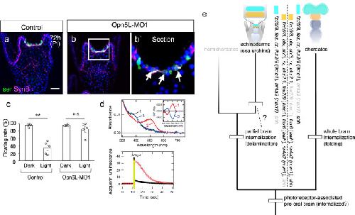 Fig. 5. Opn5L function and the potential evolutionary scenario for non-visual photoreceptive brain regional specification.a, b Expression patterns of serotonin and Synaptotagmin B (Syn B) in control and Opn5L-MO1-injected larvae. Bar = 20 µm. Opn5L-MO1-injected larvae developed into pluteus larvae similar to controls, with both anterior and dorsal serotonergic neurons observed normally (b, b’). The boxed region in (b) is magnified in (b’). Arrows indicate dorsal serotonergic neurons. c Differences in floating rates between control and Opn5L-MO1-injected larvae under dark and light conditions. Control and Opn5L morphants were cultured in light or dark conditions from 24 hours post-fertilization, and the number of actively swimming larvae (without sinking) was counted at the four-day larval stage. Control larvae continued to swim in the dark, but their swimming rates decreased significantly under light conditions. In contrast, Opn5L morphants maintained high swimming rates under both dark and light conditions. Photon flux density was set to 150–200 μmol m⁻² s⁻¹. The mean swimming rate in control larvae was 95.9% ± 2.1% SEM (n = 56, 33, 27, 49, 58) in the dark and 34.7% ± 7.5% SEM (n = 38, 41, 51, 32, 59) in the light. Opn5L-MO1-injected larvae showed a mean swimming rate of 96.5% ± 0.9% SEM (n = 22, 19, 22, 24, 60) in the dark and 85.7% ± 8.0% SEM (n = 48, 58, 38, 18, 61) in the light. **, p = 0.0007504; n.s., not significant, p = 0.2487. d Molecular property of H. pulcherrimus Opn5L protein. (upper panel) Spectral property of H. pulcherrimus Opn5L protein. Absorption spectra of Opn5L protein purified after the addition of 11-cis retinal were recorded in the dark (curve 1), after UV light (360 nm) irradiation (curve 2) and after subsequent yellow light (>500 nm) irradiation (curve 3). UV light irradiation shifted the spectrum from the UV region (~390 nm) to the visible region (~500 nm), and subsequent yellow light irradiation recovered the absorbance in the UV region. Combined with the results for S. purpuratus Opn5L protein (see Supplementary Fig. 7), sea urchin Opn5L is a UV-sensitive bistable opsin like vertebrate Opsin5. (inset) Spectral changes of H. pulcherrimus Opn5L protein caused by UV light irradiation (curve 1) and subsequent yellow light irradiation (curve 2). (lower panel) Opn5L-evoked elevation of intracellular Ca2+ level. The Ca2+ level change in H. pulcherrimus Opn5L-transfected (red curve) or mock-transfected (black curve) HEK293 cells was measured using an aequorin-based luminescent assay. Data are presented as the means of two independent experiments. A transient elevation of the luminescence by light irradiation from UV LED light (365 nm) was observed in Opn5L-expressing cells. This means that H. pulcherrimus Opn5L triggers the intracellular Ca2+ signaling in a light-dependent manner like vertebrate Opsin5. e Conserved gene expression patterns (see Supplementary Fig. 8) in the non-visual photoreceptive brain region between echinoderms and chordates. Gray text indicates genes that are not expressed. While the process and/or pattern of neuronal internalization differs between the two groups, this variation may be linked to differences in the complexity of brain development and evolution. Light blue, future telencephalon (-like); orange, future diencephalon (-like). |
