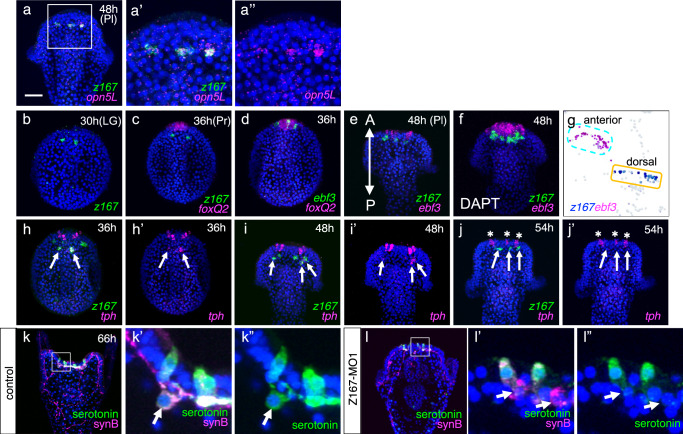 Fig. 2. Gene expression patterns and function of Z167 in dorsal serotonergic neurons, in which opn5L is expressed.a Co-expression of opn5L and z167 at 48-hour pluteus larva. Bar = 20 µm. a’, a” Magnified image of a square in (a). b Expression pattern of z167 in 30-hour late gastrula (LG). Detection of z167 began around 30 hours, with 43.3% of larvae (n = 203) showing z167 signals. c Co-expression pattern of z167 and foxQ2 in 36-hour prism larvae. d Co-expression pattern of ebf3 and foxQ2 in 36-hour larvae. Co-expression pattern of z167 and ebf3 in 48-hour pluteus larvae under control conditions (e) and with DAPT treatment (f). A, anterior; P, posterior. g UMAP representation of z167- and ebf3-expressing cells. h–j. Co-expression pattern of z167 and tph in 36- to 54-hour larvae. Expression of tph in dorsal serotonergic neurons was transient, and the tph signal was nearly undetectable in 54-hour larvae (j, j’, arrows). The number of tph-positive cells in the dorsal region was 1.53 ± 0.22 (N = 3, n = 53, 27, 7) in 48-hour larvae and 0.58 ± 0.24 (N = 3, n = 10, 14, 15) in 54-hour larvae. In contrast, z167 expression persisted beyond 54 hours, suggesting that the z167 probe serves as a reliable marker for dorsal serotonergic neurons. The number of z167-positive cells was 3.1 (n = 39), with 100% detection in 54-hour larvae. Arrows indicate dorsal serotonergic neurons, and asterisks indicate anterior serotonergic neurons. k, l Expression patterns of serotonin and Synaptotagmin B (SynB) in control larvae (o) and z167 morphants (l). In z167 morphants, SynB (neuronal marker) was detected in the region where dorsal serotonergic neurons are typically found, whereas serotonin signals were absent (l–l”). The boxed regions in k and l are magnified in k’, k” and l’, l”, respectively. Arrows indicate dorsal serotonergic neurons. |