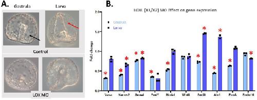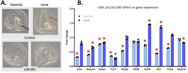Fig. 7. Knockdown of LOXL(X1/X2) affects all germ layers at gastrula and larval stage. (A) The gastrula stage LOXL(X1/X2) MO embryos are unable to invaginate to create a gut (black arrow in controls) and have a developmental delay in the larval stage. LOXL(X1/X2) MO larval stage are also lacking skeletal rods (red arrow in control). (B) RNA accumulation by qPCR of important cell type markers in gastrula and larval stage LOXL(X1/X2) MO embryos show significant changes in most genes. The y-axis of the graph represents the fold change in RNA expression in LOXL(X1/X2) MO embryos compared to a control normalized to 1 at the same time point in development. Dark-blue bars represent gastrula stage embryos and light-blue bars represent the larval stage. *P<0.005. Embryos are approximatively 100 μm in diameter.
