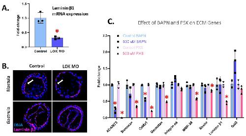 Fig. 8. Effect of LOX inhibition on other ECM genes. (A) Laminin-beta-1 expression in LOXL(X1/X2) MO gastrula-stage embryos through qPCR analysis. The expression of laminin-beta-1 significantly (P<0.05) decreased in embryos injected with LOXL(X1/X2) MO compared to the control. (B) Immunofluorescence of laminin-beta-1 (pink) and DNA (blue) show a slight decrease in expression in the LOXL(X1/X2) MO embryos complementary to the qPCR data. (C) RNA accumulation by qPCR analysis of ECM-associated genes in 500 µM BAPN- or PXS-treated embryos at gastrula stage. Embryos were treated with drugs from blastula to gastrula stage. ADAMTS and Collagen4a1 are significantly downregulated in both BAPN- and PXS-treated embryos. *P<0.001. The y-axis of the graph represents the fold change in RNA expression in the LOX-inhibited embryos compared to a control normalized to 1 at the same time point in development. Embryos are approximatively 100 μm in diameter.