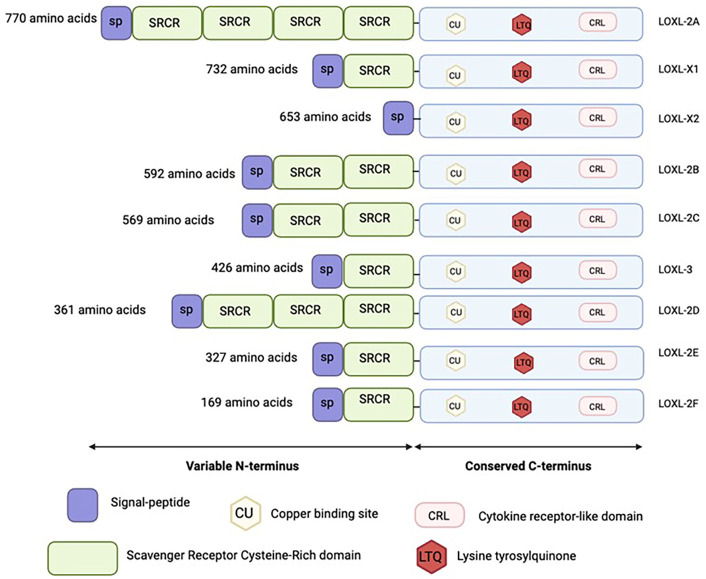 Fig. 1. S. purpuratus LOX isoforms. Eight LOX genes were identified on Echinobase and contain the characteristic LOX domain (Telmer et al., 2024). One of the genes encodes two different isoforms (LOXL-X1 and LOXL-X2). They all contain a conserved C-terminus domain including the copper binding site, lysine tyrosylquinone, and cytokine receptor-like domain. The N-terminus is variable with differing number of SRCR domain repeats. LOXL(X1/X2) was chosen for further research due to its expression in early development (Fig. 2A). Further gene identification is available in Fig. S1. Created in BioRender by Oulhen, N. (2025). https://BioRender.com/ywfnjqh. This figure was sublicensed under CC-BY 4.0 terms.